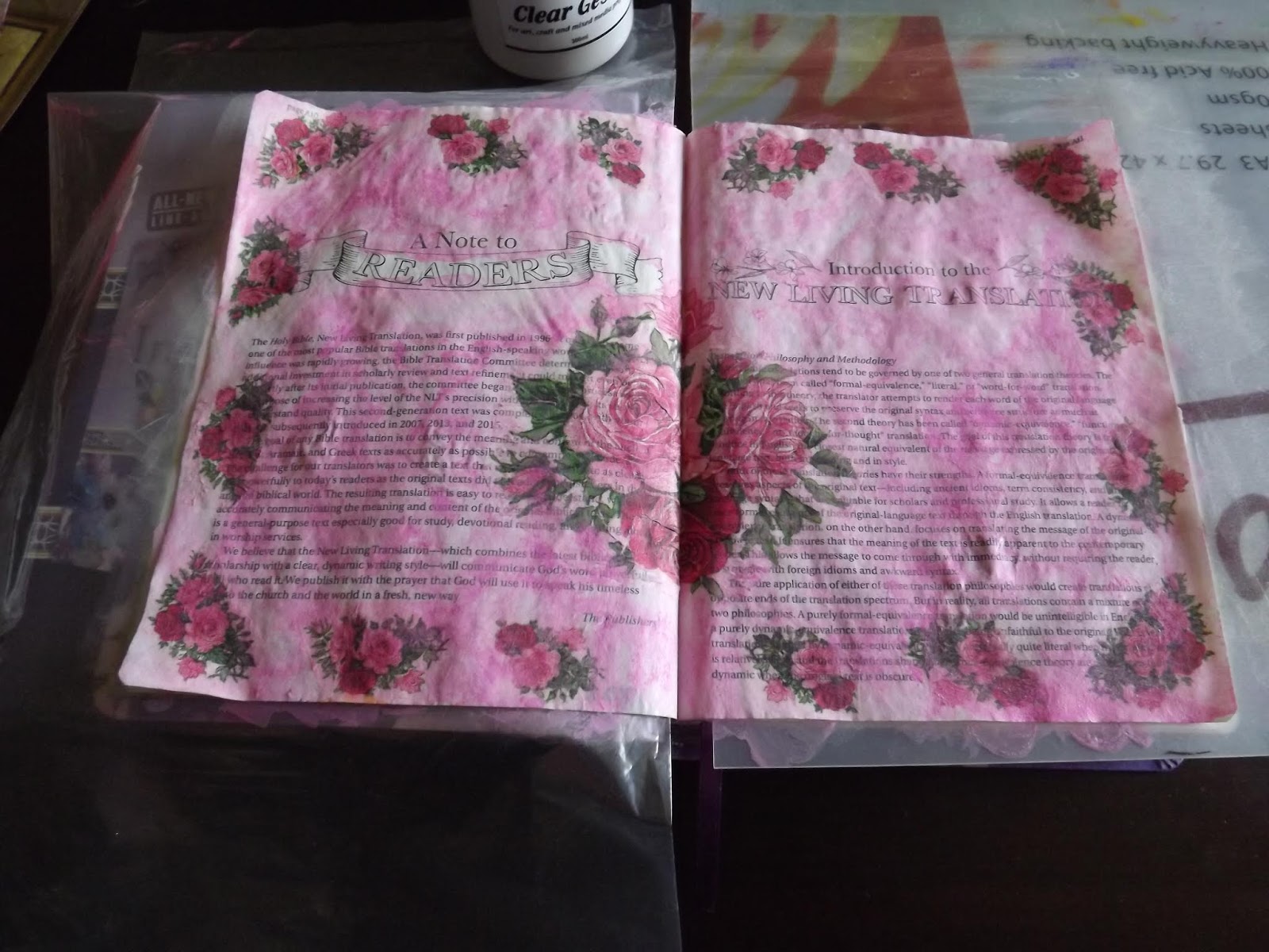 I used Dala Acrylic Matt Glaze Medium to decoupage the motifs to the Bible pages.